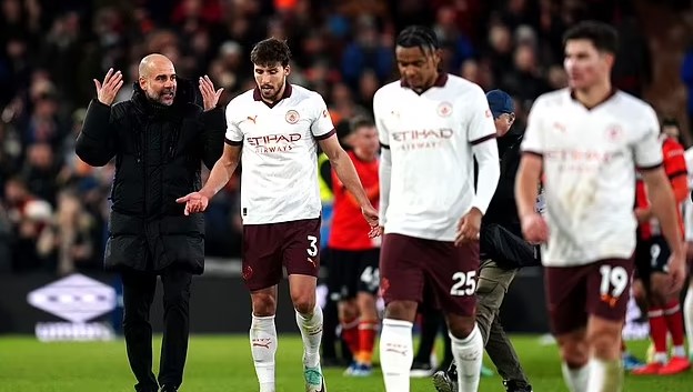 曼城队的球星们在周日战胜卢顿镇的比赛中场休息时被告知不要为自己感到难过,这场比赛结束了瓜迪奥拉在英格兰最艰难的时期。 在伊利亚·阿德巴约在半场结束时头球破门之前,英超冠军已经四场比赛未尝胜绩。 瓜迪奥拉在球员通道里与克雷格·鲍森就上半场缺乏补时时间进行了深入交谈。 曼城队